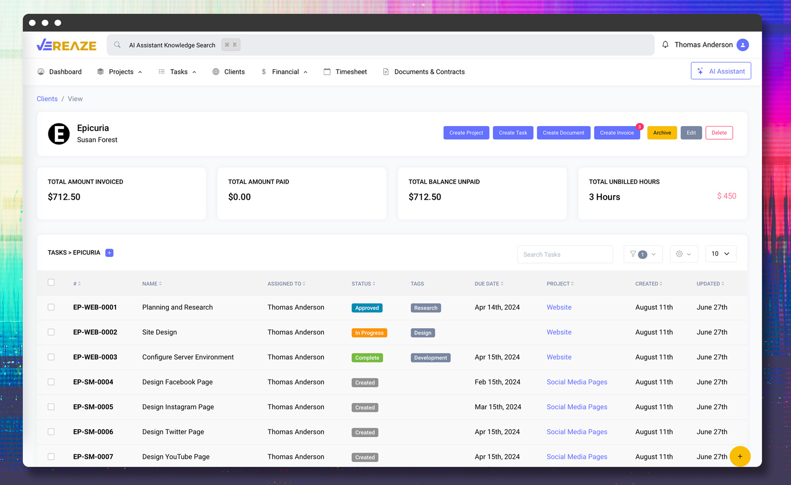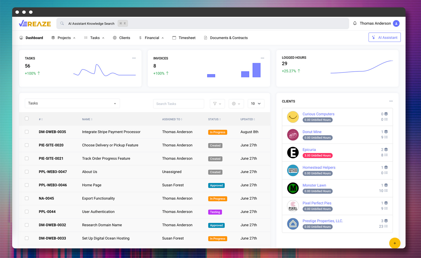 Solution: Vereaze centralizes project management, enhances team collaboration, and simplifies invoicing and expense tracking for improved business control and growth.