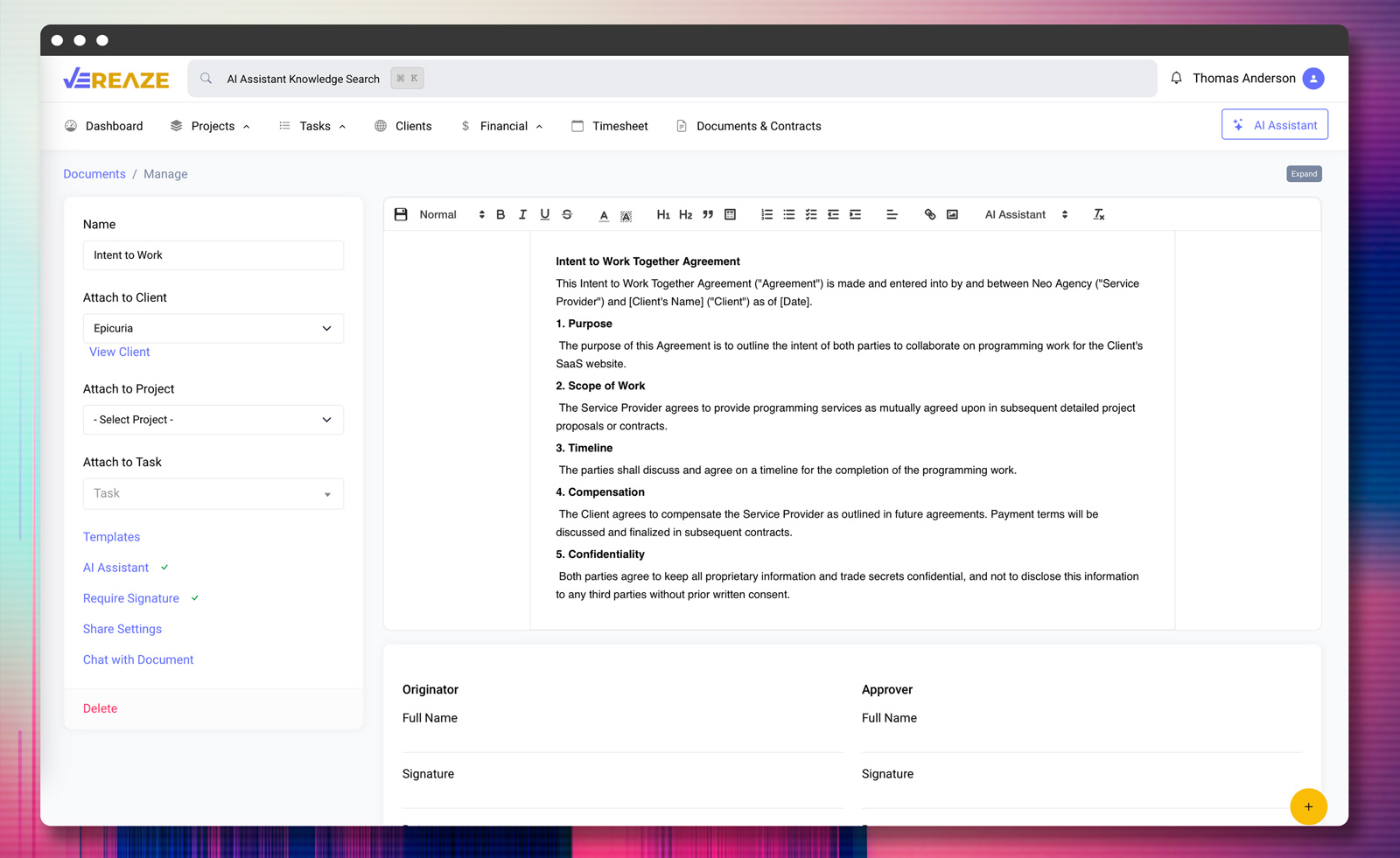 Create beautiful documents, turn them into powerful contracts, and e-sign digital signatures to ensure confidence for you and your clients. Use the AI Assistant to chat with your documents.